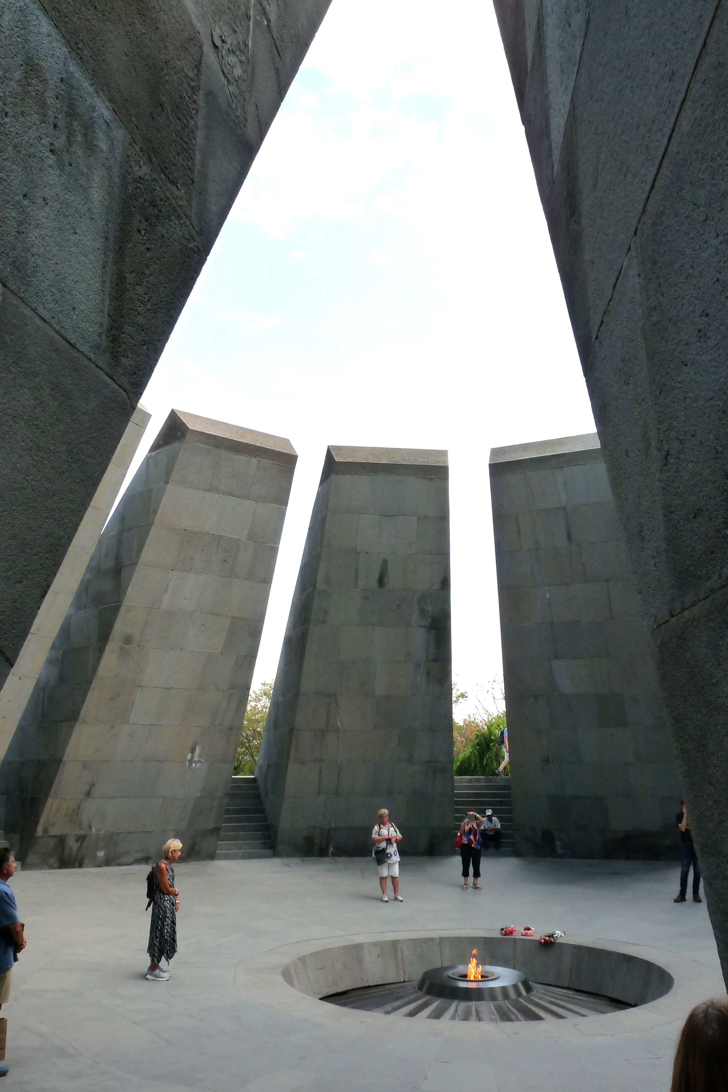 2) De herdenkingshal: 12 schuin geplaatste betonnen platen, die de 12 verloren Armeense provincies in het huidige Turkije vertegenwoordigen en waar duizenden werden vermoord. In het midden de eeuwig brandende vlam die 1,5 m lager ligt.