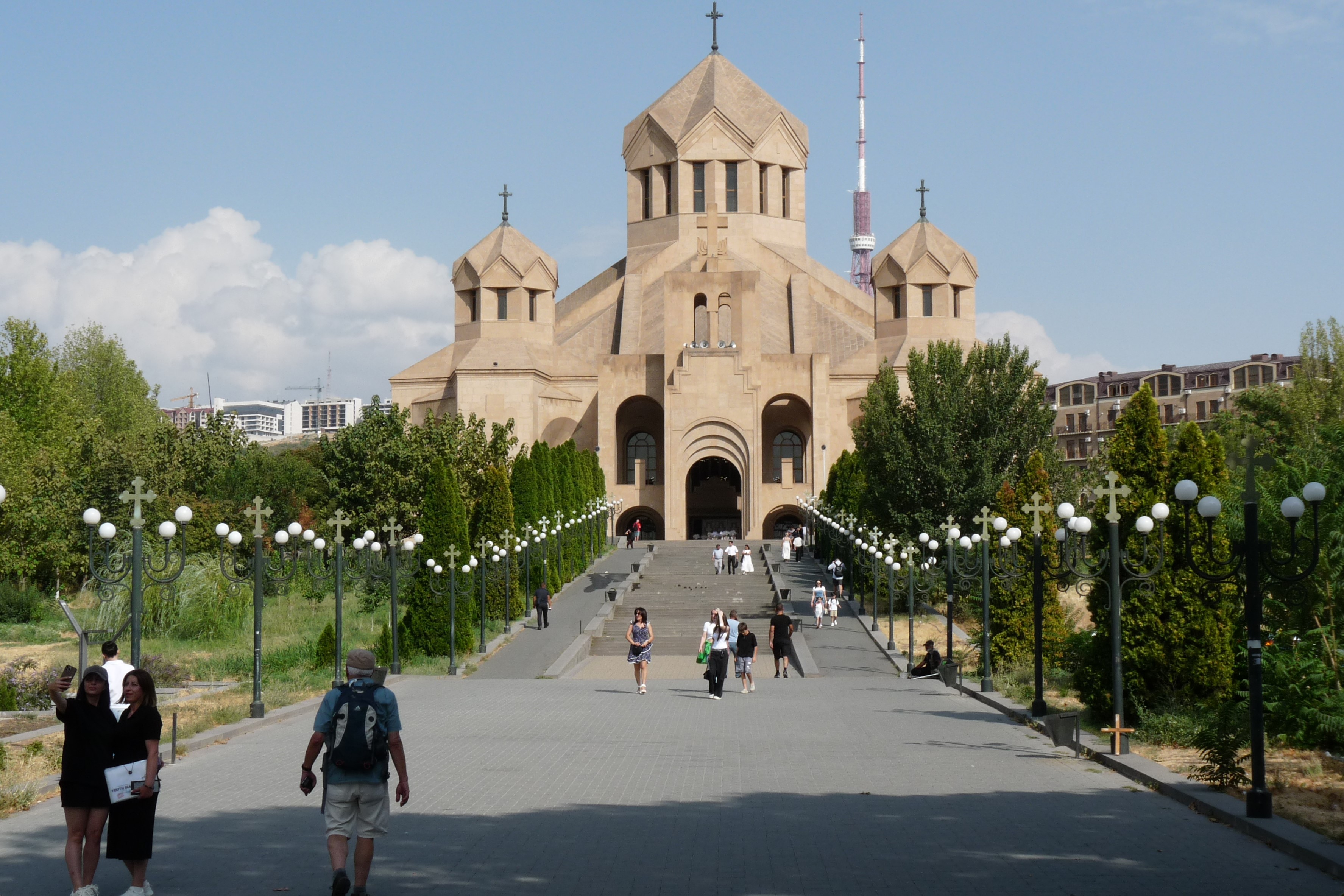 De Blauwe Moskee slaan we even over. Wel komen we nog langs een grote, min of meer nieuwe kerk: de St. Gregorius-de-Verlichterkathedraal (2001). Deze ligt op een plateau. Het is grootste kerk van Armenië en werd gebouwd t.g.v. de 1700e verjaardag van het christendom in Armenië en heeft dan ook 1700 stoelen. In twee zijkapellen zijn nog eens 300 zitplaatsen.