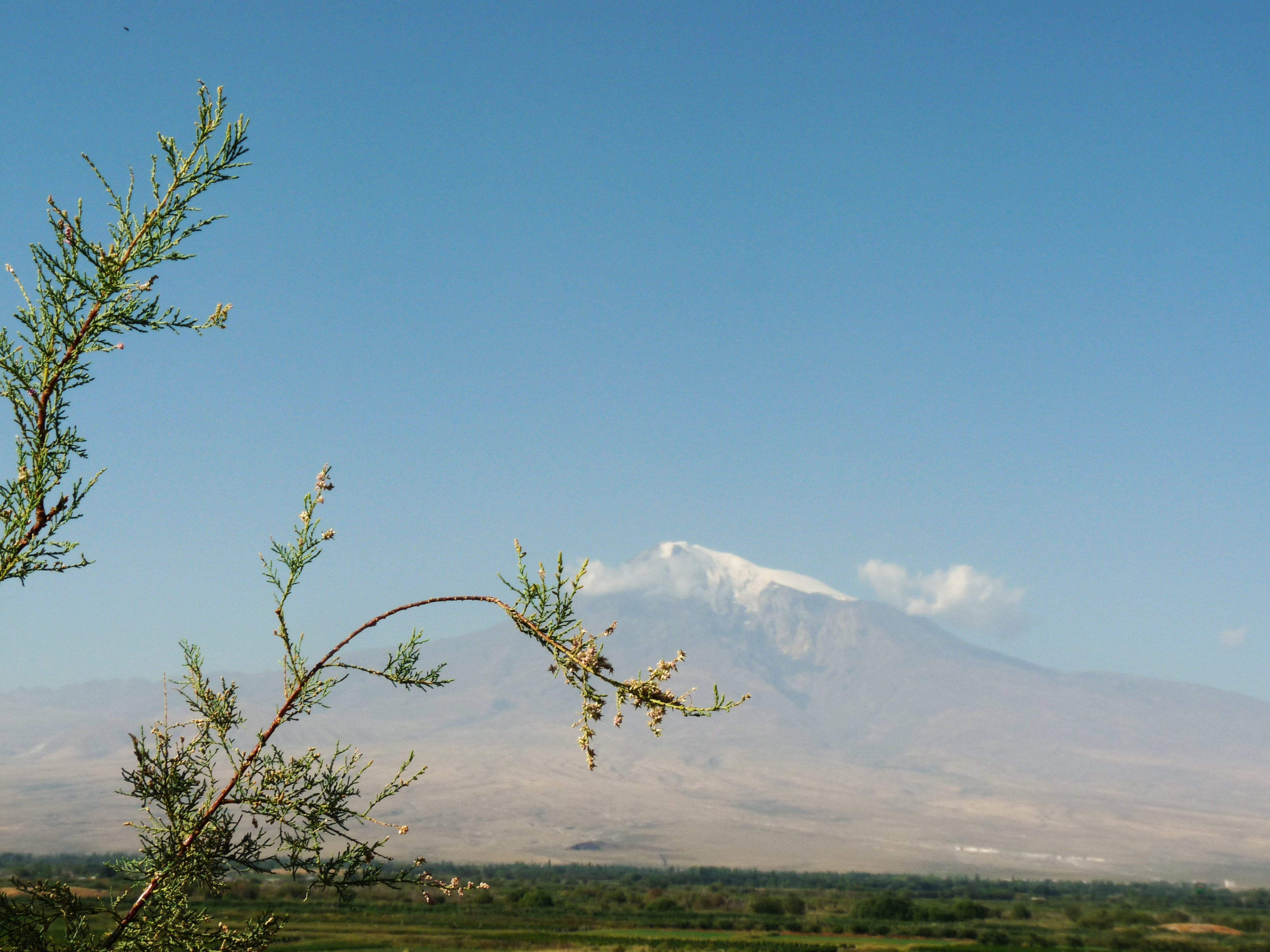 Vanmorgen gaan we eerst naar het Geghardklooster. Onderweg stoppen we bij een punt waar je de berg Ararat zou kunnen zien. We moeten wel héél goed kijken, want het is een beetje heiig.