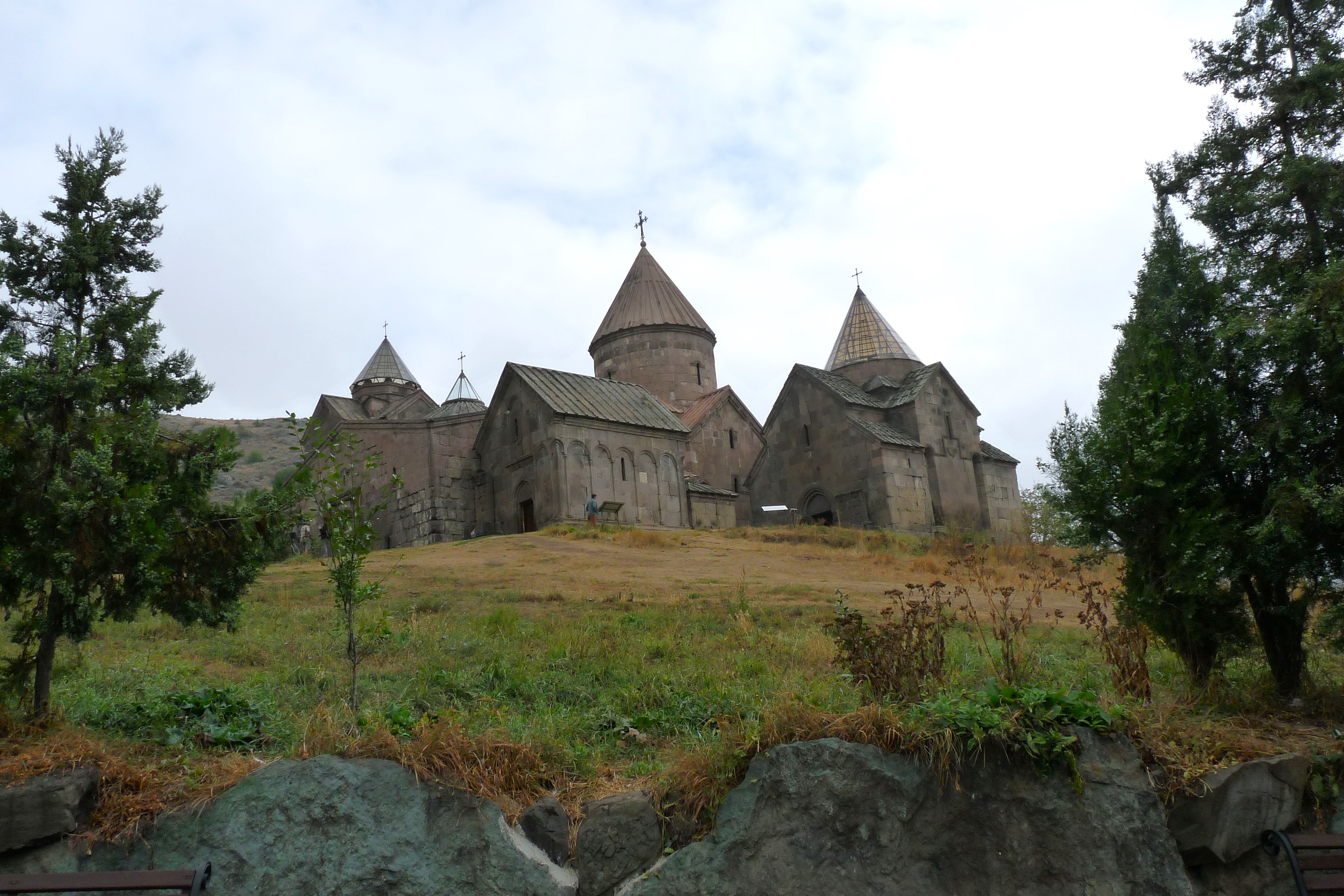 Eerst rijden we naar het Goshavankklooster in het dorpje Gosh. Goshavank betekent ‘klooster van Gosh’ en werd gebouwd in de 12e eeuw. Het werd vernoemd naar de beroemde Armeense geleerde Mkhitar Gosh. Vroeger was er een grote bibliotheek met wel 15.000 boeken, maar die zijn bijna allemaal vernield door de Mongolen. Goshavank is vooral bekend om haar unieke middeleeuwse chatsjkars.