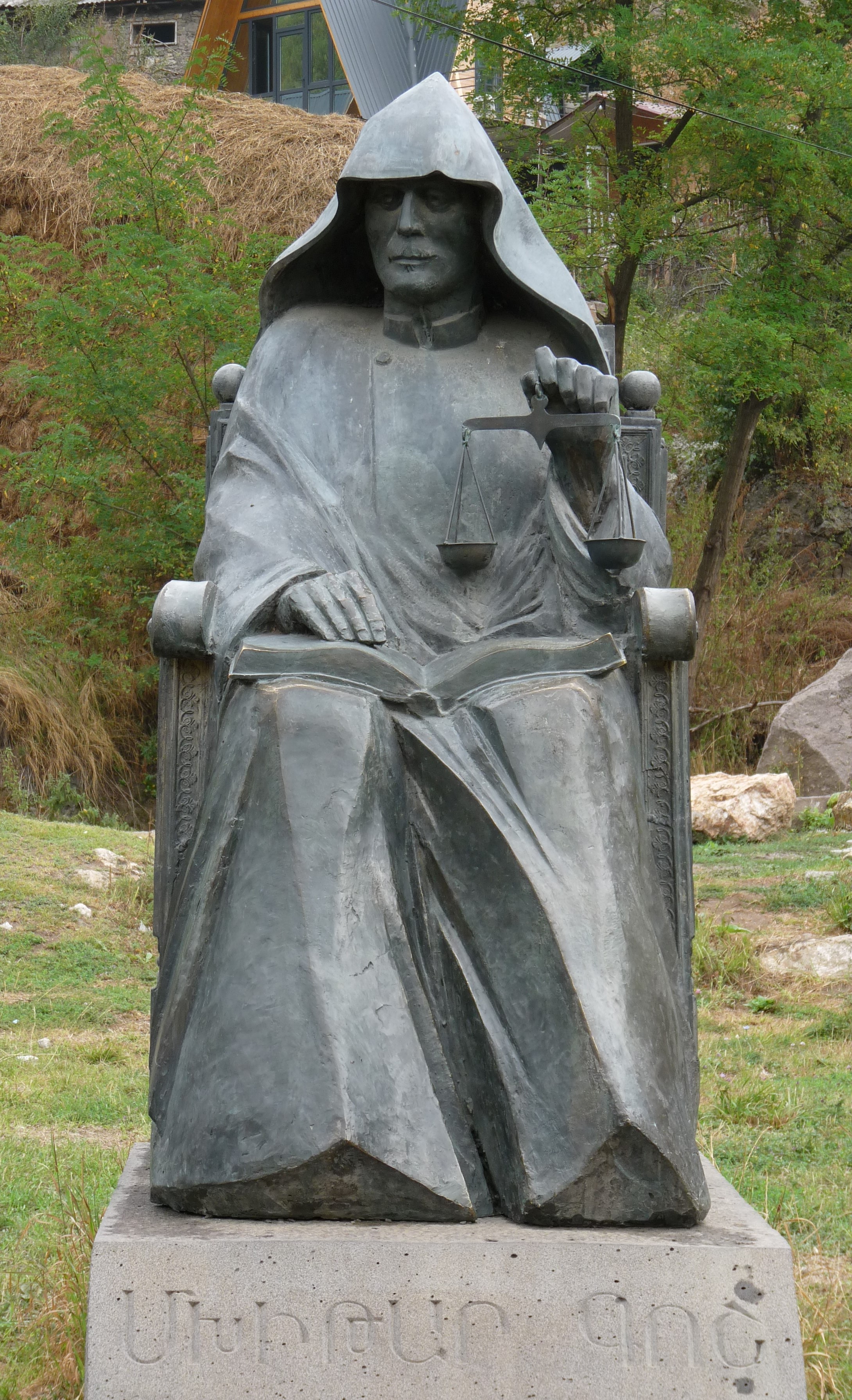 Wat verderop in Oshakan gaan we naar een oud kerkje. Erachter staat het standbeeld van Mesrop Mashtotts met de letters van het Armeense alfabet, dat in 405 n.C. door hem werd ontwikkeld.