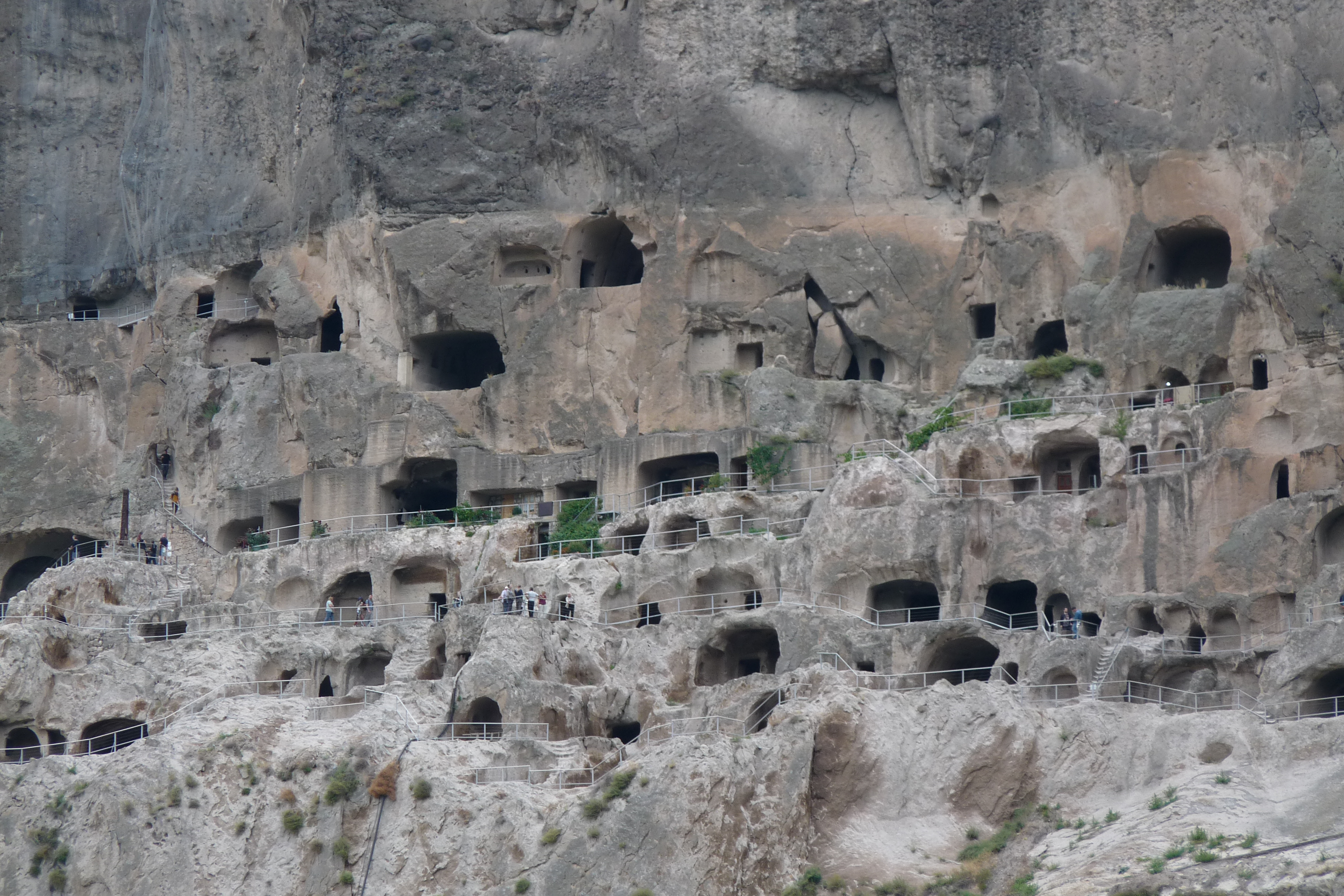 We lunchen erg leuk in een restaurant aan de rivier. We zijn dan niet ver meer van Vardzia. Daar aangekomen gaan we vanaf de kaartverkoop met de shuttlebus naar boven en lopen dan via hoge ongelijke trappen door de grottenstad. Het is behoorlijk klimmen af en toe.