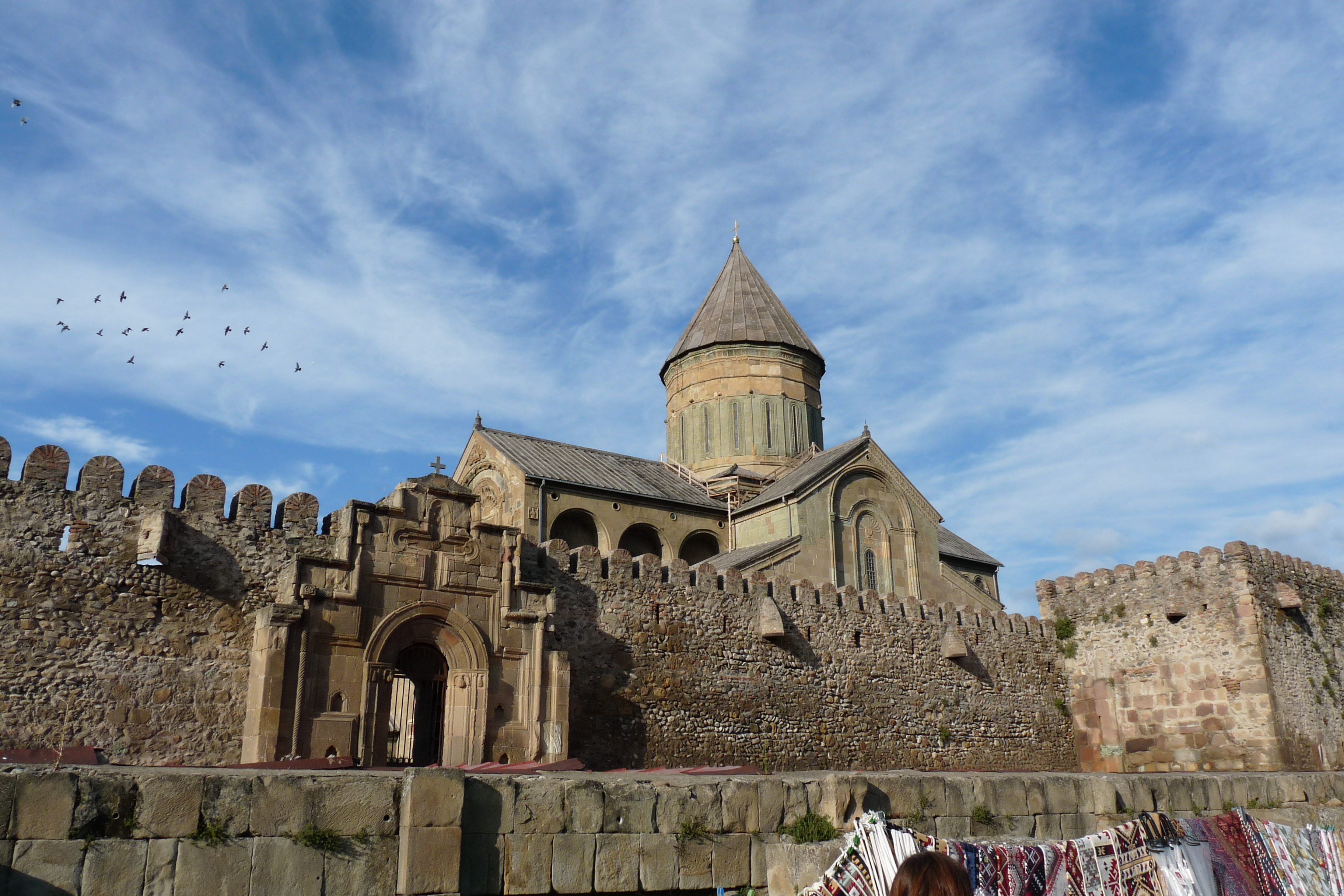 Nu naar Mtskheta. Inmiddels hebben we zo ongeveer in elk plaatsje of op elke heuveltop prachtige kerken en kloosters gezien, dus daarop is Mtskheta geen uitzondering. Wél uitzonderlijk is de historische status van dit stadje. Mtskheta was lang geleden namelijk de hoofdstad van Georgië en een belangrijke handelsstad van de Zijderoute. Hier bekeerde het toenmalige koningspaar zich in de 4e eeuw tot het christendom. Dat is ook de reden waarom de belangrijkste kerk van het land, de Svetitskhoveli kathedraal, nog steeds in dit stadje staat. Deze kathedraal is ook een belangrijk pelgrimsoord. Svetitskhoveli betekent letterlijk ‘levensgevende kolom’. Natuurlijk is er een verhaal (en daar houd ik zo van!) over het waarom van deze naam: In de 1e eeuw was Elioz uit Mtscheta aanwezig bij de kruisiging van Jezus in Jeruzalem. Elioz kocht Jezus' mantel van een Romeinse soldaat en bracht hem naar Georgië om hem vervolgens aan zijn zus Sidonia te geven. Overmand door emoties stortte ze in en stierf. Toen de mantel niet uit haar handen kon worden genomen werd ze ermee begraven op de plek waar ze stierf. Er groeide een cipres op haar graf en mensen vertelden dat ze van ziekten waren genezen, nadat ze onder de takken ervan hadden gestaan. De koning besloot toen op deze plek een kerk te bouwen. Hij kapte de cipres om en vormde er zeven zuilen van, die als funderingspijlers voor de kerk zouden dienen. Een ervan zweefde op magische wijze de lucht in en keerde pas terug naar de aarde nadat de heilige Nino de hele nacht had gebeden. Uit de zuil zou een heilige vloeistof stromen die mensen van alle ziekten genas.