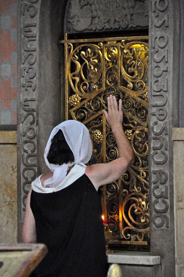 Evenals in Armenië dragen vrouwen in de kerk een hoofddoekje. En ook hier slaan zowel mannen als vrouwen bij het passeren van een kerk een kruisje.