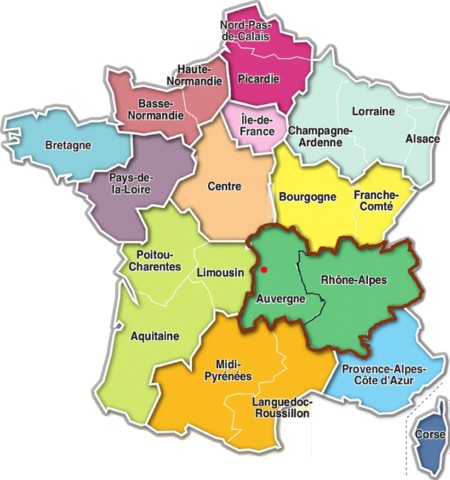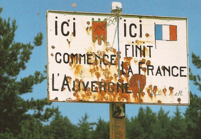 Tegen het middaguur zijn we in berggebied aangekomen: het Massif de Sancy. Hier wordt ’s winters geskied en zo hier en daar zie je nu nog kleine plakken sneeuw boven liggen. We vinden langs een zijweggetje een kleine auberge, zetten de auto daar neer en gaan nog een kleine wandeling maken want de hond wil ook wel even lopen. Overal bloeit de brem. Langs de berghellingen zie je grote gele velden met deze struiken, prachtig. Er loopt hier een heel klein riviertje, dat vrijwel het begin van de Dordogne blijkt te zijn. Die loopt dus vanuit midden Frankrijk in rechte lijn in westelijke richting. Witte koeien grazen aan het kleine stroompje, tussen bomen en de gele brem. Hoe romantisch wil je het hebben?