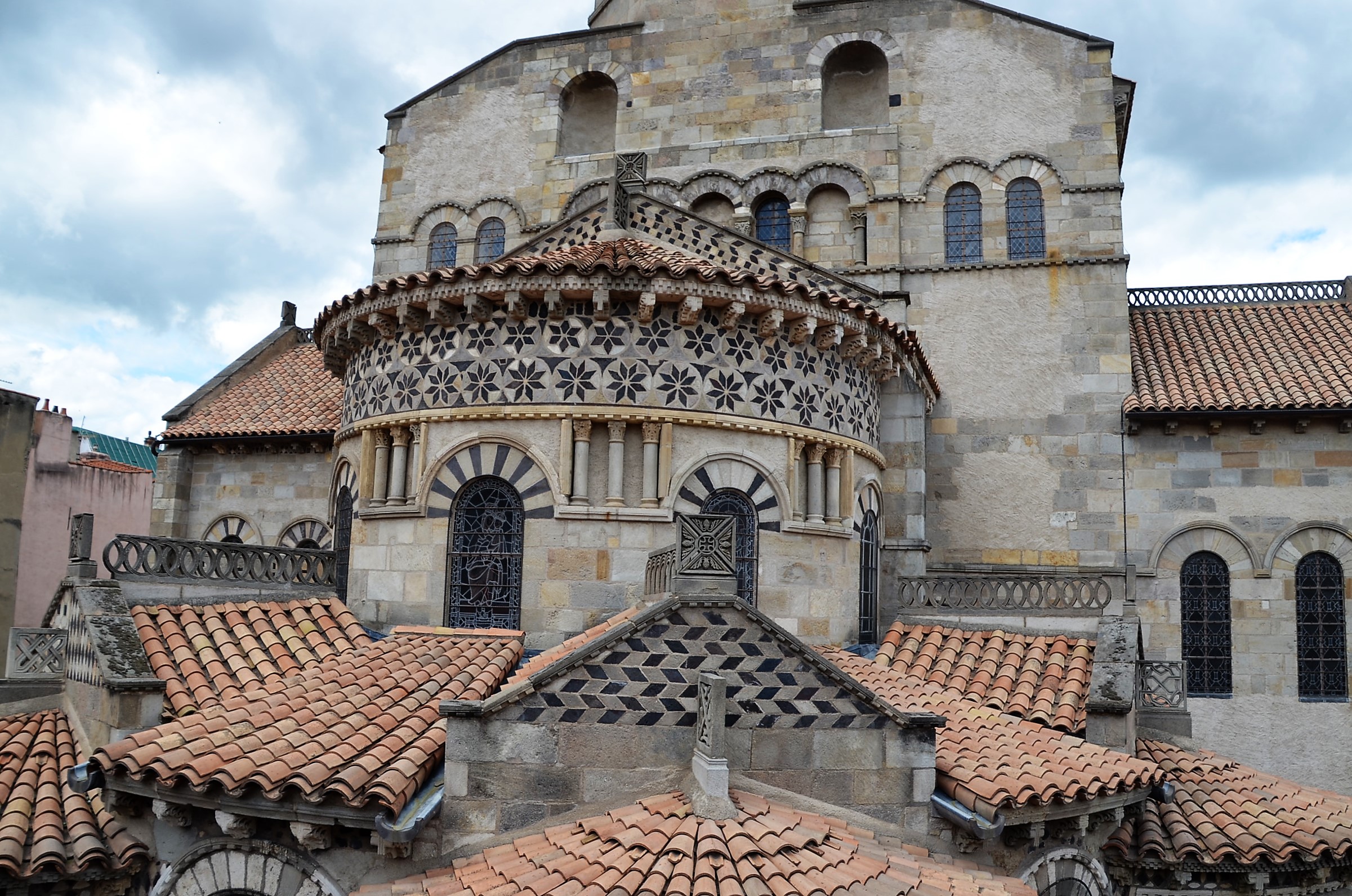 Beneden in de crypte staat een kleine zwarte madonna uit de 18e eeuw en een oude doopvont. Als je om de kerk loopt ziet de kerk er boven de apsis heel anders uit. Het doet ons denken aan de kerk in Monréale op Sicilië, waarbij de voor- en achterkant ook zo verschilden. Dit dak is goed te zien vanaf het belvédère. Maar dat is even zoeken. Dankzij vriendelijke voorbijgangers komen we er: het blijkt een soort binnenbalcon van een appartementengebouw te zijn!