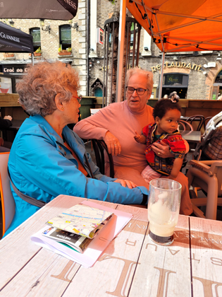 Hier in de buurt drinken we op een terrasje onze eerste Guinness, het bekende donkerbruine Ierse bier. Het is een tikkie bitter; Jan vindt het niet zo lekker. We raken aan de praat met een vrouw die daar met haar kleinkind zit. Een erg leuk gesprek.