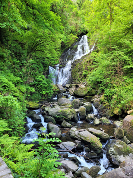 Vandaag rijden we de bekende Ring of Kerry. Dit is een populaire toeristische rondrit in Ierland. De rit volgt de kust van het schiereiland Iveragh en ligt, zoals de naam al zegt, in County Kerry. Vaak is Killarney de start van deze rit.Onze eerste stop is bij de Torc waterval, niet ver van Killarney. Het is een mooie, maar niet heel hoge waterval van 20 m hoog. Maar hij ligt in een werkelijk schitterend stuk bos met heel veel rododendrons, soms meters hoog.