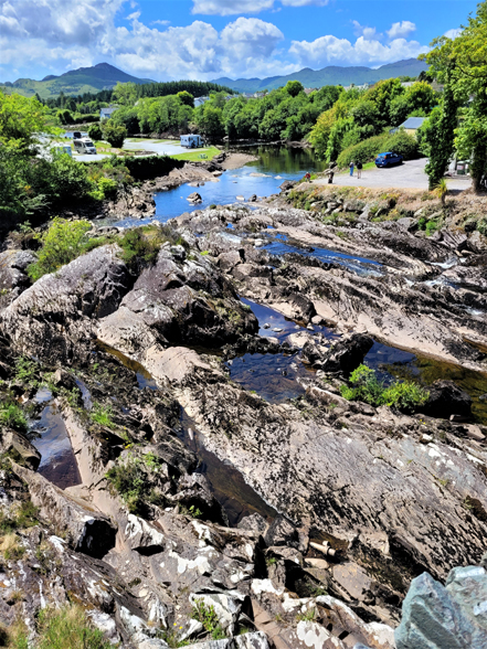 Onderweg hier en daar een fotostop. We lunchen bij een restaurant langs de weg. Langs het mooie riviertje de Sneem ligt een plaats met dezelfde naam. Hier trakteren we onszelf op een lekker ijsje. Maar oh, wat is alles in Ierland duur: één bescheiden bolletje voor €3,50. Dus we genieten er extra van.