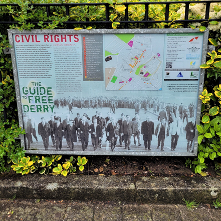 Grofweg kun je zeggen dat nu Londonderry de benaming is voor unionisten (aanhangers van het Verenigd Koninkrijk) en Derry voor nationalisten (mensen die het liefst zien dat Noord-Ierland onderdeel zou zijn van de Republiek Ierland). De stad heeft zwaar geleden onder de ‘Troubles’ van de ‘Free Derry beweging’, die gestopt werden vanwege de beruchte ‘Bloody Sunday’. Nog niet zo heel lang geleden waren de stadswallen nog verboden terrein en werden zwaar bewaakt door Engelse militairen. Nu is (London)Derry een gewone Ierse stad, waar wel allerlei gedenktekens, standbeelden en plakkaten aan de eeuwenlange strijd herinneren.