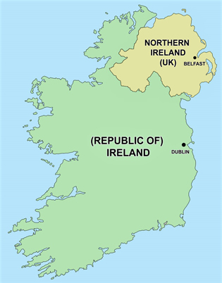 Het eiland bestaat uit 32 counties of graafschappen; 6 van hen vormen Noord-Ierland en de overige 26 vormen de Ierse Republiek.