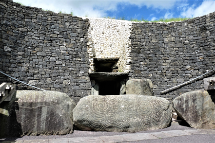 Eerst bezoeken we het museum, dat erg mooi de graven laat zien en, nog mooier, hoe de mensen in die tijd leefden. Dan gaan we met een shuttlebus naar de grafheuvel van Knowth, waar een gids ons het e.e.a. vertelt. In dit graf kan je niet komen omdat het instabiel is. Wel zijn de ingekerfde versieringen op de stenen, waarop de graven steunen, mooi te zien.