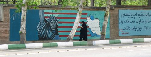 Ontbijt op de 6e etage, vanwaar we in de verte het Alborzgebergte kunnen zien liggen. Na het ontbijt lopen we even langs de voormalige Amerikaanse ambassade, die om de hoek van het hotel ligt, om de ‘vriendelijke’ muurschilderingen te bekijken. Deze plek is berucht door de 444 dagen durende bezetting en gijzeling van Amerkanen door opstandige studenten in 1979/1980. De muren rondom de compound zijn nog steeds bedekt met schilderingen die voornamelijk anti-Amerikaans zijn.