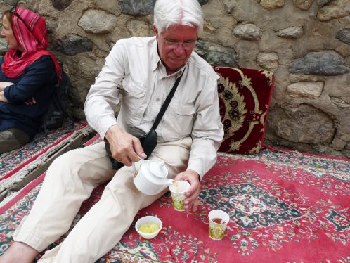 In deze tuin zoekt de plaatselijke bevolking aan het eind van de middag verkoeling tijdens de hitte van de lange zomer, lekker theeleutend op een soort bedden waarop tapijten liggen. Ook wij drinken een kop thee met saffraankandij.