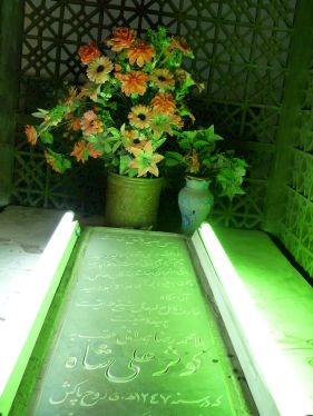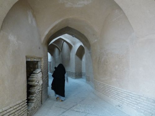 Een uurtje uitblazen in het hotel en dan nemen we een taxi naar de bazaar van Kashan. In deze stad loopt vrijwel elke vrouw in chador. Als ze snel lopen lijken het wel grote fladderende vogels. Iedereen is vriendelijk en we worden een aantal malen aangesproken door min of meer Engels sprekende Irani’s. Deze historische bazaar is een van de oudste in Iran. Het dak met de vele koepels dateert dan wel uit de 19e eeuw, maar deze plek is al bijna 800 jaar het centrale punt in Kashan waar handel wordt gedreven. Je ziet er veel rozenwater en rozenparfum, een product waar deze stad bekend om is. Het wordt gebruikt in gerechten en ook gedronken, want het schijnt goed te zijn tegen allerlei kwalen. Verder is hier van alles te koop, tapijten, sieraden, snoep en andere zoetigheid, lappen stof (veel zwart voor de chadors), speelgoed, enz. We zien een groen verlicht pand dat bij nader onderzoek een klein mausoleum blijkt te zijn. Een vrouw gebaart dat we binnen mogen kijken als we onze schoenen uit doen. In een kleine ruimte zitten een paar vrouwen bij een soort tombe te bidden en er is nog een oude man aanwezig.