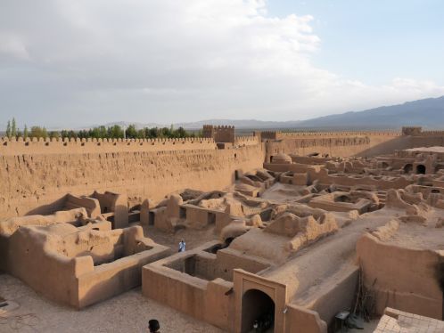 Terwijl de chauffeurs de lunch klaar maken lopen wij de inmiddels verlaten oude stad in, die is opgetrokken uit leem. Veel geruïneerde gebouwen, waarvan de bewoners nu voor onderhoudsvriendelijker behuizing gekozen hebben, geven de indruk in de middeleeuwen beland te zijn. Op een binnenplaats zien we een paar kamelen en wat kippen scharrelen.