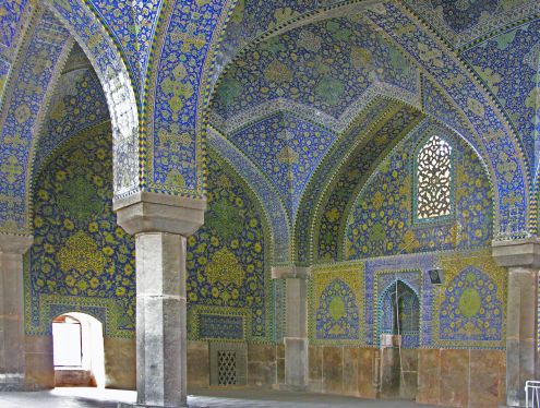 De iwan, de ingang, is evenwijdig aan het plein Meidan Emam. De rest van de moskee ligt daarachter en staat onder een hoek van ongeveer 45 graden met het symmetrische 16de-eeuwse plein in de richting van Mekka. Een rijkelijk gedecoreerd gebouw met vier bemozaïekte minaretten en halfopen gebedsruimten rond een grote binnenplaats. Geen millimeter muur of plafond is er ongemoeid gelaten: overal handgeschilderde glazuurtegeltjes en mozaïeken in bloemmotieven, geometrische patronen en gekalligrafeerde religieuze teksten.
