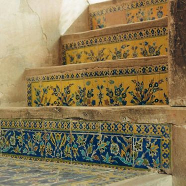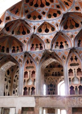 Eerlijk gezegd valt Ali Qapu ons een beetje tegen. Maar misschien komt het ook omdat we net zoveel schitterends hebben gezien en we een beetje moe van alle indrukken zijn. Vrij ongewoon zijn de schilderingen van de natuur. Er zijn zowel bloemen, vogels als andere dieren afgebeeld en ook mensen ontbreken niet. Deze schilderingen zullen ongetwijfeld heel fraai geweest zijn, maar nu zijn ze wel heel erg aangetast door de tijd. De muziekkamer is echter wel heel erg de moeite waard. Er zijn ‘fluisterhoeken’ waar je zachtjes wat kunt zeggen, maar het aan de andere hoek nog heel goed te horen is. Het schijnt dat de hier toegepaste akoestiek in onze tijd nog steeds een voorbeeld is. Heel mooi vormgegeven: mooi opengewerkt en fijn van kleur. Maar je moet hiervoor wel naar de 6e etage klimmen via een wenteltrap met van die ongemakkelijke hoge stenen treden.