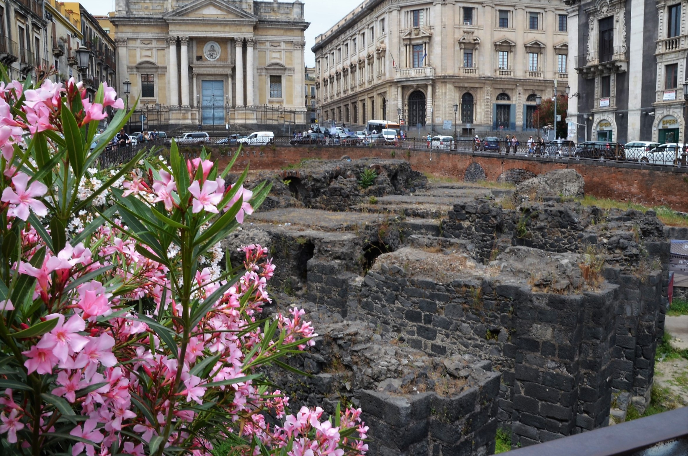 Wat verderop zien we de resten van het Romeinse Amfitheater. Bij de aardbeving van 1693 was er al weinig meer over van het theater. De marmeren versieringen waren al gebruikt voor de bouw van de kathedraal.