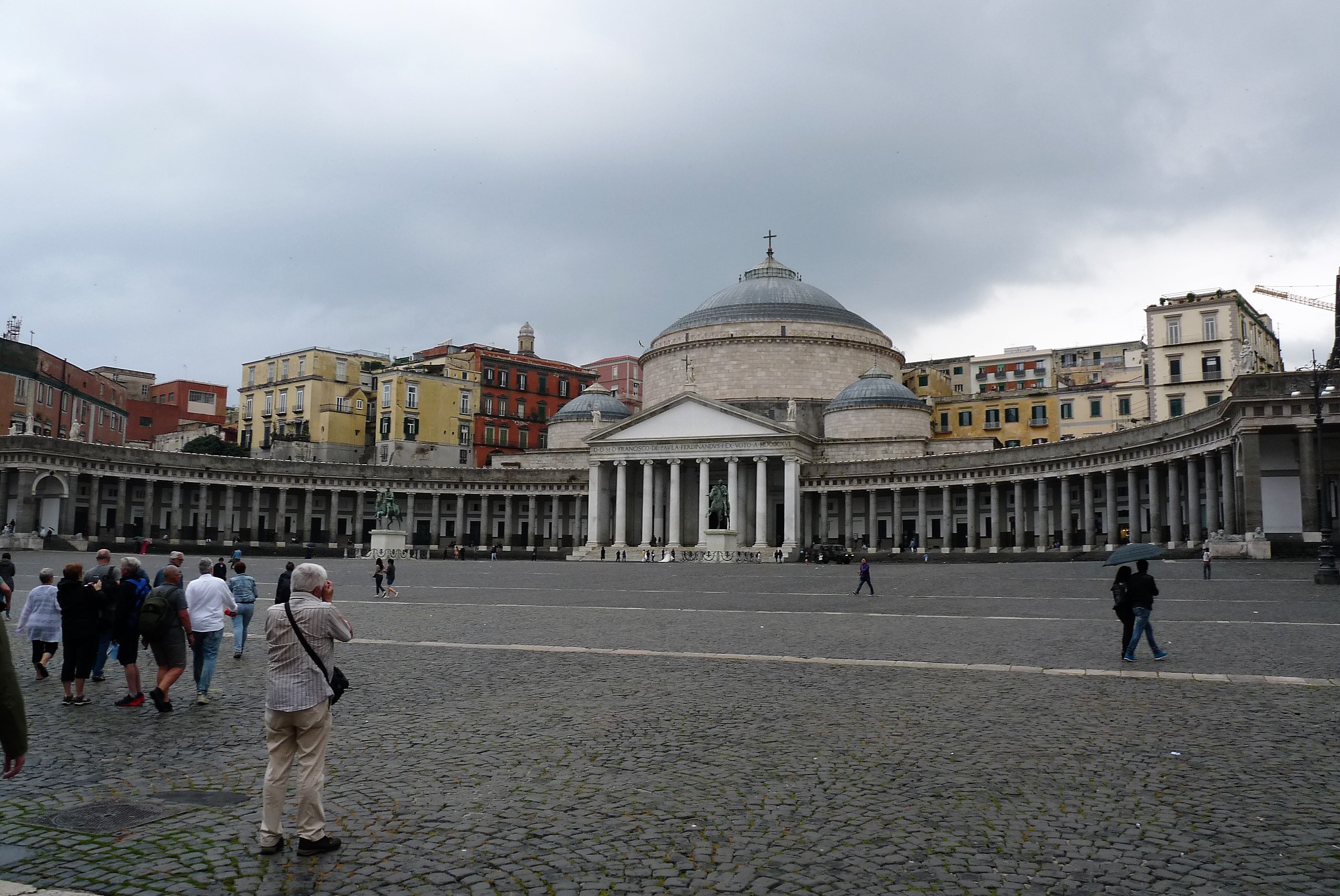 Even verderop ligt Piazza del Plebiscito. Ooit was dit het hart van de stad. Van de 13e tot 19e eeuw was Napels de hoofdstad van een van de belangrijkste koninkrijken van Italië en dat is hier te zien. Het is dan ook het grootste plein van Napels en het heeft een brede boog van neoklassieke zuilen. Het Palazzo was de residentie van Napolitaanse koningen. De acht beelden langs de gevel vertegenwoordigen de hoofden van de verschillende dynastieën die regeerden over Napels. Verder op dit plein o.a. een kerk, waarvoor het Romeinse Pantheon als voorbeeld heeft gediend en nog enkele andere overheidsgebouwen.
