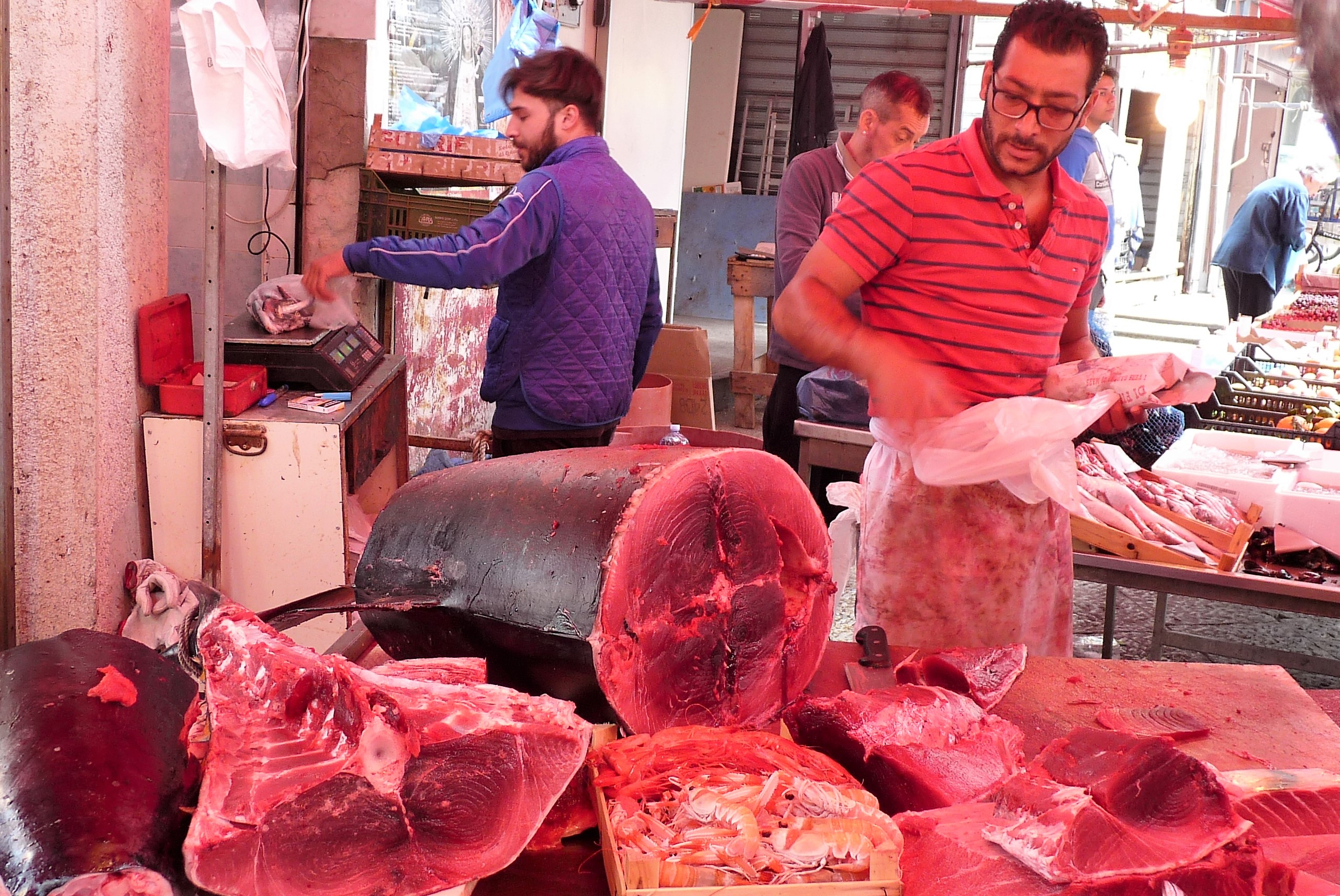 In Catania lopen we van het station direct naar de vismarkt, La Pescheria, in het centrum. Het is de oudste markt van de stad. Wat een spektakel! Wat een chaos! Kris-kras door elkaar schreeuwende marktkooplieden.