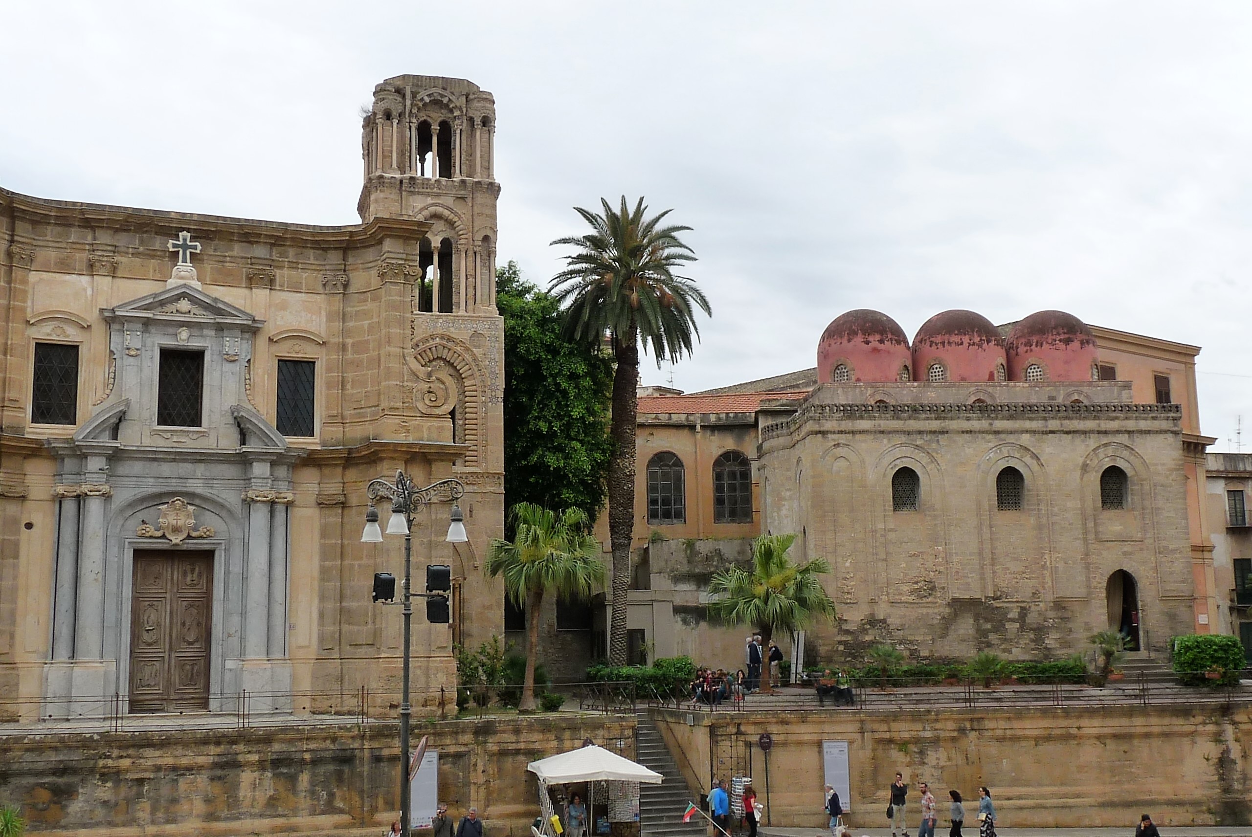 Op de Piazza Bellini staat een van oorsprong Normandische kerk (La Martorana) gezusterlijk naast een kerk met sterk Arabische invloeden, de San Cataldo. De eerste is van binnen rijkelijk versierd met mozaïeken en kreeg later een barokke gevel. De rechthoekige San Cataldo kerk met de typisch Arabische roze koepels is van binnen juist heel sober. De mozaïekvloer is arabisch. De San Cataldo werd in de 12e eeuw gebouwd en werd in de 18e eeuw niet meer als kerk gebruikt. Op een gegeven moment deed het pand zelfs dienst als postkantoor! Aan het eind van de 19e eeuw werd de kerk volledig gerestaureerd en in ere hersteld. Ik vind de San Cantaldo vooral erg mooi vanwege de eenvoud en intimiteit, want deze kerk is heel klein.