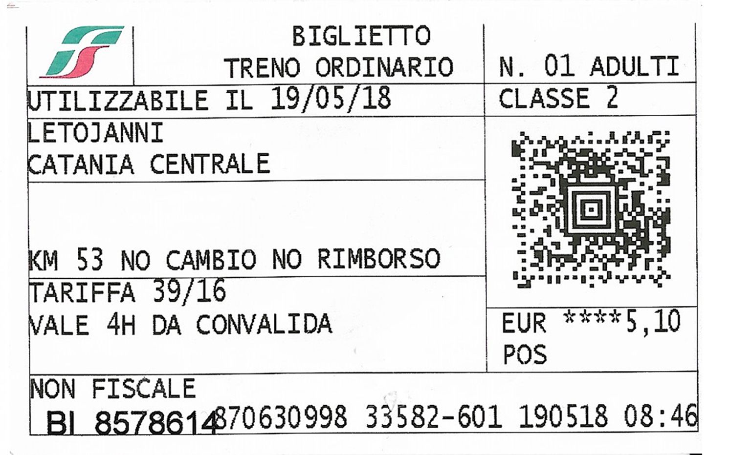 De laatste dag al weer. We zien het niet zitten om de hele dag in een badplaats als Letojanni te blijven; we zijn geen strandmensen. Dus staan we al voor negen uur op het stationnetje om met de trein naar Catania te gaan. Er is alleen een kaartautomaat. Weliswaar kan je de instructies ook in het Engels lezen, maar dat wil nog niet zeggen dat het dan vlekkeloos verloopt. Het kost behoorlijk wat tijd eer we van twee treinkaartjes voorzien zijn.