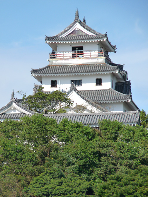 Boven de stad zien we het in de 60-er jaren van de vorige eeuw herbouwde wit geschilderde kasteel liggen. Het wordt Maizuro-jo (=vliegende-kraanvogelkasteel) genoemd vanwege de kleur en ligging.