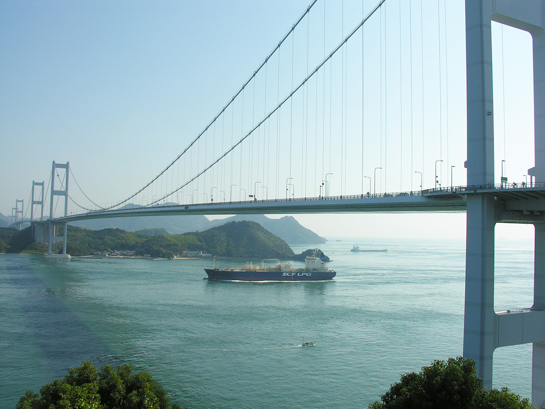 Nog één stop voordat we definitief naar Nagasaki rijden, namelijk bij een nieuwe en oude brug. Het water perst zich hier door een nauwe opening en, afhankelijk van het tij, vormen zich onder de brug grote draaikolken. Helaas niet als wij er zijn. We lopen over de nieuwe brug en dat is al indrukwekkend.
