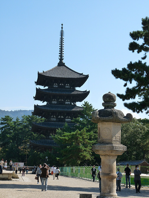 Als eerste gaan we naar de Kofuku-ji, die in 710 gebouwd werd. Eens bestond de tempel uit 175 gebouwen, maar die zijn inmiddels allemaal afgebrand. De huidige `hondo' (hoofdzaal) dateert uit 1819. De pagode van vijf verdiepingen stamt uit 1426 en is de op één na hoogste van Japan.