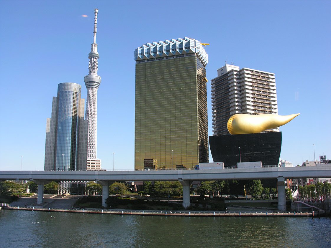Hier halen we eerst een beker koffie en met een broodje erbij zitten we heerlijk in het zonnetje met uitzicht op de Tokyo Skytree en de Asahi Beer Hall, een van de grootste bierbrouwers van het land. De Tokyo Skytree is een nieuwe (2011) TV-toren. Met een hoogte van 634 m is het nu het hoogste gebouw in Japan en het twee na hoogste in de wereld. Vanaf platforms op 350 en 450 m hoogte kun je over Tokyo kijken, maar dat schijnt wel een paar centen te kosten. De Asahi Beer Hall is een ontwerp van Philippe Starck. Het gebouw lijkt een beetje op een glas bier: goudgeel met een witte 'schuimkraag' aan de bovenkant. En dat is natuurlijk ook de bedoeling. Daarnaast een wat vreemd goudkleurig object, de 'flamme d'or', door de Japanners spottend 'de gouden drol' genoemd.