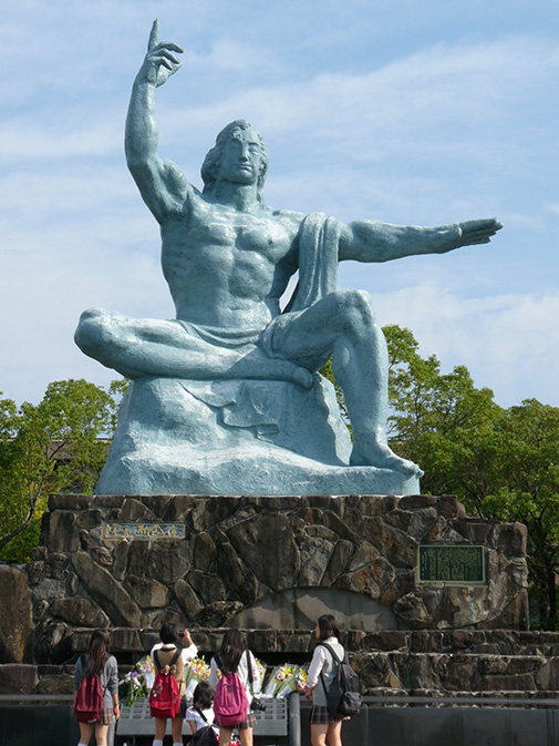 Vandaag is het noordelijk stadsdeel aan de beurt. Met de tram gaanwe naar het vredespark, Heiwa Koen. Ze hebben er de funderingen laten staan van de gevangenis die daar in 1945 stond. Alle 134 medewerkers en gevangenen, waarbij ook een onbekend aantal Nederlandse krijgsgevangenen, zijn daar om 11.02 uur om het leven gekomen. Een zwarte zuil geeft de exacte plaats aan waar de atoombom is gevallen, die ca. 15.000 slachtoffers maakte. In het park staan verschillende beelden door diverse landen schonken. Het meest prominente is het Vredesbeeld, een 10 meter hoog beeldhouwwerk in het noorden van het park. Zijn opgestoken rechterhand symboliseert de bedreiging van atoombommen, terwijl zijn uitgestoken linkerhand eeuwige vrede voorstelt. Het opgevouwen rechterbeen en het staande linkerbeen staan respectievelijk voor meditatie en de wil om op te staan.