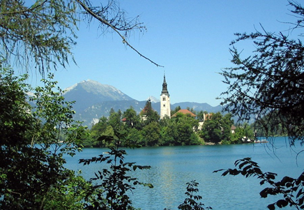 Terug naar de auto. We rijden naar het Meer van Bohinj. Het is hier veel rustiger dan in Bled, veel minder bebouwing rond het meer. Je ziet meer van de natuurlijke omgeving. We rijden er omheen. Ernaast staat een mooi oud kerkje. Vervolgens rijden we naar Bled. Het is inmiddels 22.00 uur. Het kasteel en het kerkje op het eiland zijn verlicht. Het is nog erg warm. Op een terras drinken we wat en eten Kremna Rezina, een soort tompouce. Tot slot weer naar Ljubljana.