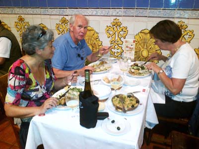 We worden langs een steil straatje naar boven gebracht en lopen daar naar Miradoura de São Pedro de Alcântara, een klein parkje met bomen, banken, een fontein, een terrasje en natuurlijk met een prachtig uitzicht. In het licht van de ondergaande zon is het allemaal nog mooier. Op het terras nemen we een fles vinho verde. Fijn sfeertje, aangename temperatuur, lekker wijntje, mooi uitzicht ... wat wil een mens nog meer? Dan lopen we voor de tweede keer die dag naar Cervejaria da Trindade en eten alle drie Portugals nationale gerecht: bacalhau (stokvis=gezouten gedroogde vis), maar wel op verschillende manieren klaargemaakt. Men zegt dat er in Portugal 365 manieren zijn om deze vis klaar te maken; wij proefden er slechts drie.