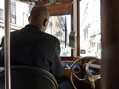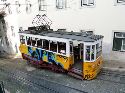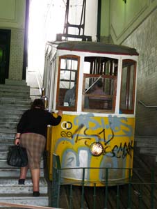 Met de bus rijden we naar de Praça dos Restauradores, een groot plein met een hoge obelisk. In een zijstraatje nemen we de Elevador da Glória, die de wijken Baixa en Bairro-Alto verbindt. Behalve de Elevador de Santa Justa, zijn de andere drie liften van Lissabon eigenlijk kabeltrams, waarbij de dalende tramwagen de stijgende omhoog trekt.