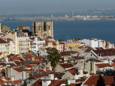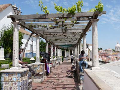 Met het trammetje gaan we weer een stukje verder en stappen uit bij de Miradouro de Santa Luzia, waar we op een terras lunchen. Het uitkijkpunt heeft een pergola met bankjes. Tegen het witte kerkje van Santa Luzia zijn twee taferelen van azulejos aangebracht. Eén van de twee stelt Lissabon voor, zoals het vóór de aardbeving van 1755 was.