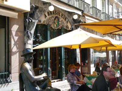 We gaan met de metro naar de benedenstad en stappen recht voor pastelaria A Brasileira uit, het beroemdste café van de stad. En dat vooral dankzij de dichter Pessoa, die hier graag kwam. Hij zit nu buiten, in brons gegoten, aan een tafeltje.