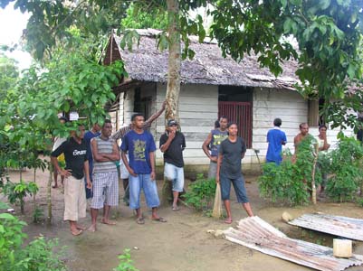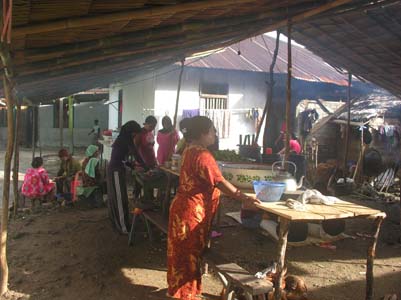 Eerst begin je aan jezelf te twijfelen als je dit ziet, maar dan blijkt dat je gelukkig niets mankeert want heremietkrabbetjes kruipen in lege schelpen en dragen deze dan mee, zoals een slak zijn huisje. We picknicken aan het strand. Intussen is het steeds harder gaan waaien dus de natte kleding is al snel weer droog. Maar dat betekent ook dat er meer en hogere golven zijn, die tijdens de terugtocht geregeld over de boten slaan en dus was het genot van droge kleren maar van heel korte duur. In een badkuip kun je niet natter worden!! Als verzopen katten komen we terug in Sawai. De tweede helft van de middag brengen we door met lezen en andere rustgevende activiteiten. Na een fikse regenbui neemt de wind af en wordt de zee weer kalm, dus tijd om nog even samen Sawai in te lopen. De straatjes zijn erg smal en auto’s en ander verkeer zie je hier niet; alles gaat via bootjes over zee. In verband met de bruiloft die morgen in het dorp zal plaatsvinden wordt er bij het schooltje een dansje geoefend. Voor ons willen ze het nog wel eens doen. Er wordt door de meisjes bij gezongen terwijl de jongens het ritme aangeven op kleine handtrommels. Jan maakt grapjes en de kinderen vinden het prachtig. Overal zijn voorbereidingen voor het feest aan de gang: er wordt muziek gemaakt en cake gebakken en bij een grote gemeenschappelijke kookplaats staat een aantal vrouwen te koken dat het een lust is. Een is wat brutaler en begint heugwiegend te dansen en Jan danst mee. Het gegil en geschater van de kokende dames is dan niet van de lucht. Overal in het dorp zijn de mensen erg vriendelijk.