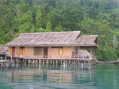 In drie kwartier varen we naar ons onderkomen voor de komende dagen in Sawai. Ons slaapverblijf bestaat uit een aantal huisjes die met elkaar verbonden zijn door vlonders. Elk heeft een paar kamers. Deze huisjes zijn gebouwd op palen en staan in zee. Tussen de kieren van de planken vloer zien we het water onder ons bed en hoor je het zacht klotsen. Lakens zijn er niet, en de wanden lopen niet tot het dak door, zodat de wind er door kan waaien en er ’s nachts toch wat koelte is bij gebrek aan een ventilator of airco. Je moet dus wel rekening houden met wat je zegt, want in de kamer ernaast is alles te horen. Het dak is van atap (palmbladeren). Elektriciteit is er alleen tussen 18.00 en 23.00 uur ’s avonds. Tanden poetsen moet boven de toiletpot gebeuren of hangend uit het raam. Bepaald niet luxe allemaal, maar het plekje is zo prachtig dat dit allemaal niet belangrijk is. Aan de ene kant kijken we op de zee en de bergen en aan de andere kant ligt het dorpje Sawai.