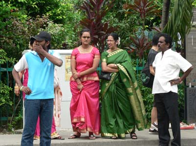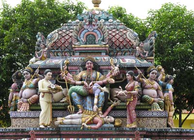 Zo weinig als er gisteren in de Chinese wijk te doen was, zo levendig is het hier. Prachtig, al die donkere vrouwen met hun fel gekleurde sari’s, en wat zijn er veel goudwinkeltjes. De Sri Veeramahaliamatempel, is gewijd aan de hindoegodin Kali. Voor de ingang hangt een slinger gemaakt van bloemen. De gevel, mierzoet van kleur, is zeer rijk gedecoreerd. Schoenen uit en dan naar binnen. Het is er erg druk: men zit, bidt, praat, brengt offers en loopt een aantal malen om een heiligdom heen. Ook is er een bruidspaar met familie.