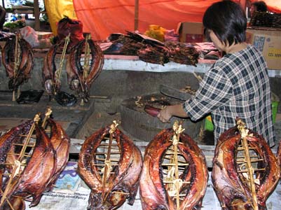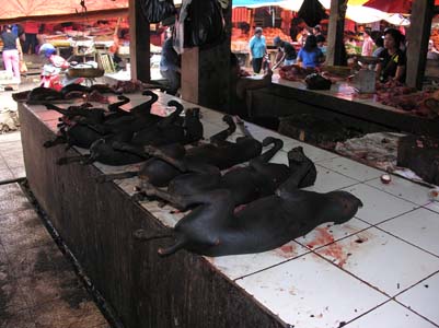 Bij de vleesafdeling liggen varkenskoppen gelaten te kijken naar wat er over is van de rest van hun lijf. Verder honden in alle stadia: van met z’n allen zielig in een hokje tot hapklare brok. Verder gebraden vliegende honden (een soort vleermuis) en een kruising van rat en muis op stokjes. De verkopers zijn erg vriendelijk en als we ergens naar kijken noemen ze de naam ervan. Dan naar het meer van Tondano, maar helaas begint het daar heel erg hard te regenen en zit de lucht potdicht. Prima moment dus om heerlijk te lunchen in een restaurantje aan het meer met o.a. kip, vis en ‘gestampte goudvis’ (visgehakt in de vorm van platte koekjes) en een van mijn lievelingsgerechten nl. fricadel jagung (maiskoeken).
