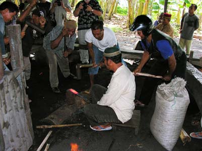 We verplaatsen ons met 3 minibusjes over dit door de natuur zo rijk bedeelde vulkaaneilandje. Tidore staat bekend om het degelijke smeedwerk. Wij bezoeken nu zo’n smederij in het plaatsjeTomolo waar, bij het vervaardigen van de grote kapmessen, een aantal mannen op spectaculaire wijze in een zeer hoog en steeds sneller tempo om de beurt op het aambeeld beuken, zonder elkaar de hersens in te slaan.