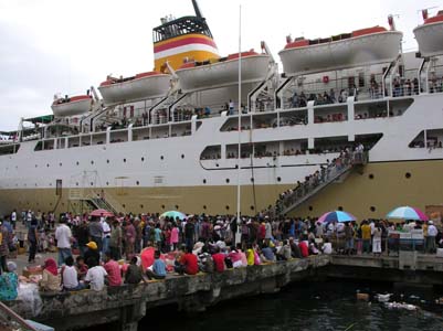 In de loop van de ochtend gaan we naar de luchthaven van Ternate om met een binnenlandse vlucht naar Ambon te vliegen met een tussenlanding van zo’n tien minuten op het eilandje Sanana. Hier eindigt de korte landingsbaan letterlijk in zee. Rond 14.30 uur landen we op Ambon, waar we kennismaken met Debby onze reisleidster voor de komende tijd en Jannes, haar assistent. Omdat we helemaal om de baai heen moeten rijden om bij de haven te komen (dat kost zeker een uur) is er geen tijd meer om naar het hotel te gaan waar een deel van de bagage achterblijft. De Pelniboot vertrekt om vijf uur, dus gaat het linea recta naar de haven waar we om 16.00 uur aankomen. Onderweg zien we de overblijfselen van de godsdienstrellen van rond de eeuwwisseling. De Pelniboot is een enorm gevaarte met zeven dekken. Het krioelt er van de mensen, zowel op de kade, als langs de railing en op de trap waar de aankomende passagiers naar beneden willen en de vertrekkende tegelijkertijd naar boven. En maar duwen en schreeuwen.