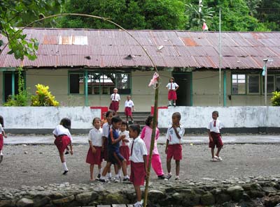 Buiten wordt het inmiddels iets lichter, maar het blijft regenachtig. We zouden vanmiddag gaan snorkelen, maar dit kan niet doorgaan vanwege het slechte weer. Dus gaan we Banda Neira maar eens verder verkennen. Het is een heerlijk rustig plaatsje vrijwel zonder auto’s, met een overvloed aan weelderig groen en tropische bloemen en geweldig vriendelijke mensen. We wandelen eerst even over het piepkleine marktje en lopen dan het plaatsje uit om de landingsbaan eens te bekijken. Deze is maar heel kort met aan het begin en eind de zee. We hebben ons laten vertellen dat bij slecht zicht hier nog wel eens een vliegtuigje door kan schieten en we begrijpen nu ook waarom voor ons vervoer naar Banda voor de Pelniboot gekozen is. We lopen een eindje terug en gaan op zoek naar de Chinese begraafplaats. Chinezen zijn er al lang niet meer, dus wordt de grond tussen de graven benut als groentetuintjes en spelen de kinderen op de grafstenen. Een eindje verderop ligt de Nederlandse (dus christelijke) begraafplaats, die bij gebrek aan christenen nu dienst doet als vuilstort en plaats waar de geiten tussen de stenen grazen.