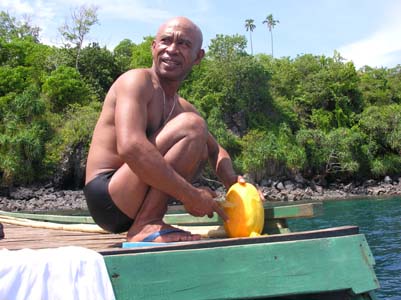 Het is stralend weer en al goed warm als we gaan ontbijten. Aan het eind van de middag zullen we weer met de Pelniboot van Banda Neira vertrekken. Jammer, het is zo’n heerlijk rustig en aangenaam plaatsje. Maar voor het zo ver is gaan we met z’n vieren met Jannes snorkelen en Jan gaat voor de gezelligheid ook mee. We varen naar de achterkant van de Gunung Api, het vulkaaneiland, waar een mooie plek is. Voor de trek tussen de middag schilt Jannes een grote papaya.