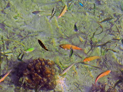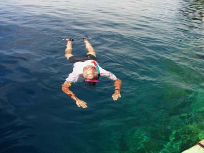 De vijf snorkelaars worden naar de achterkant van het eiland gevaren waar het mooier snorkelen is. De vissen zijn niet erg groot, maar wel erg fraai. Vooral de vormen en kleuren van het koraal zijn erg mooi. Aan het eind van de middag zijn we weer terug. En al weer wordt er ’s avonds gezongen met een nog grotere groep zangers.