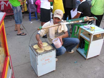 Vandaag een toertje over het eiland. Omdat er onderweg geen lunchgelegenheid is gaan we eerst naar de supermarkt om wat eetbaars in te slaan. Tegenover deze winkel staat een vrouw met allerlei zelfgemaakte zoete en hartige heerlijkheden. En terwijl Jan in de supermarkt iets van zijn gading zoekt sta ik te dubben wat ik bij haar uit al dit lekkers zal kiezen: jagung (mais)koeken, lemper (kleefrijst) met vis in pisangblad, pasteitjes gevuld met ubi (zoete aardappel), ketan (donkere kleefrijst) met gula jawa (javaanse suiker) en nog meer heerlijkheden waar ik de naam niet van ken.