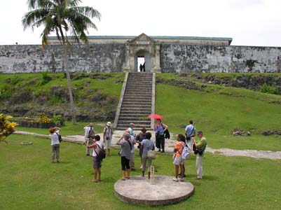 Eerst zien we de resten van het zwaar overwoekerde fort Nassau, waar niet meer dan een paar poorten en een deel van de muur van over zijn.