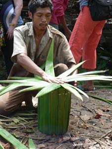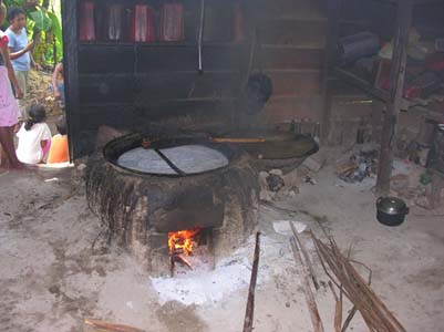 Een aantal waagt zich hier niet aan en gaat een eindje verderop met de voeten door het water. Doel van de tocht is een huisje waar ze gula (suiker) uit het sap van de arempalm maken. Het palmwater laten ze helemaal inkokem tot bruine suiker.
