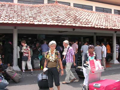 Een korte nacht: om 05.00 uur bagage inleveren en om 05.30 uur vertrek naar het vliegveld waar inmiddels onze bagage al ingecheckt is. Hier nemen we ook afscheid van Debby en Jannes. We vliegen met Lion Air, zoiets als Ryan Air dus niets te eten/drinken tijdens de vluchten. In Makassar moeten we overstappen. Sinds we hier 19 jaar geleden waren is het vliegveld nu een internationale luchthaven geworden en heeft het een mooi modern gebouw gekregen. Op het vliegveld van Denpasar op Bali worden we opgevangen door Silvester en krijgen we allemaal een krans omgehangen gemaakt van die heerlijk ruikende franchipane- of cambodjabloemen
